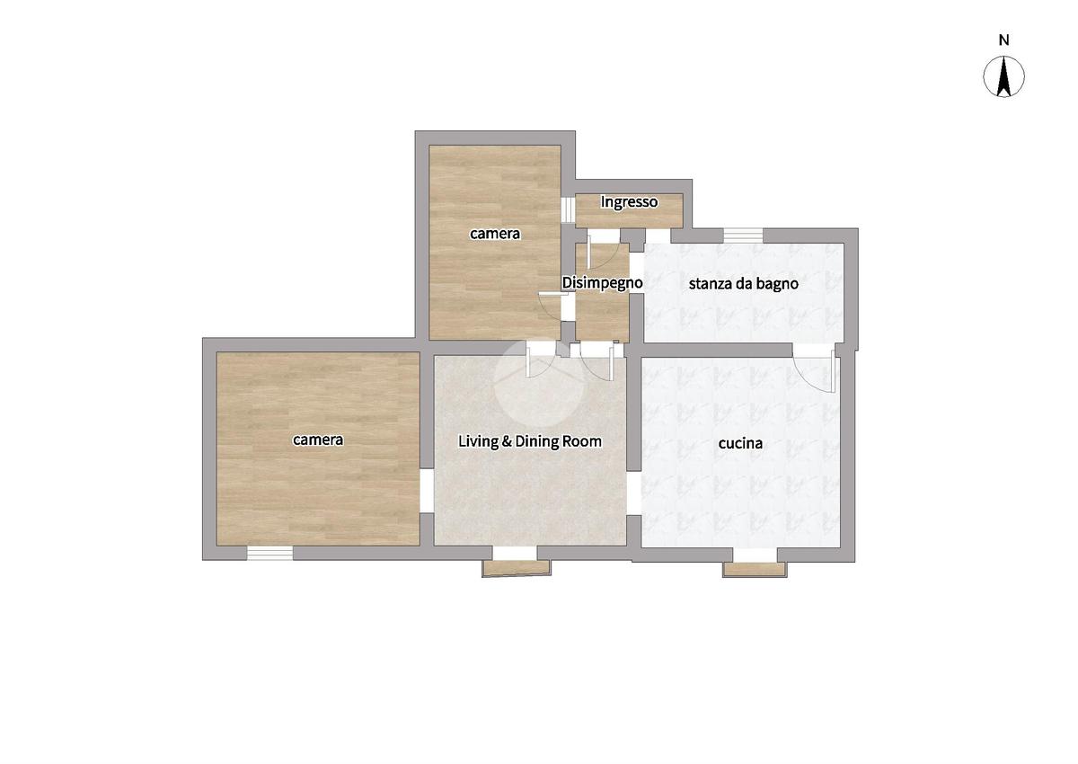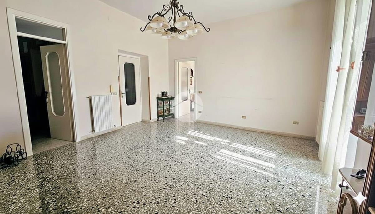 L'appartamento principale, situato al piano medio, si estende su 117,82 mq composto da una grande cucina abitabile, ampio salone molto luminoso, disimpegno, due camere matrimoniali e bagno con vasca;